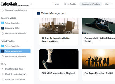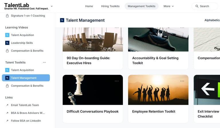 Solve HR problems with one platform — TalentLab combines custom playbooks, AI-enabled learning, community, and live coaching from Bravo Advisors experts, built for scaling businesses.